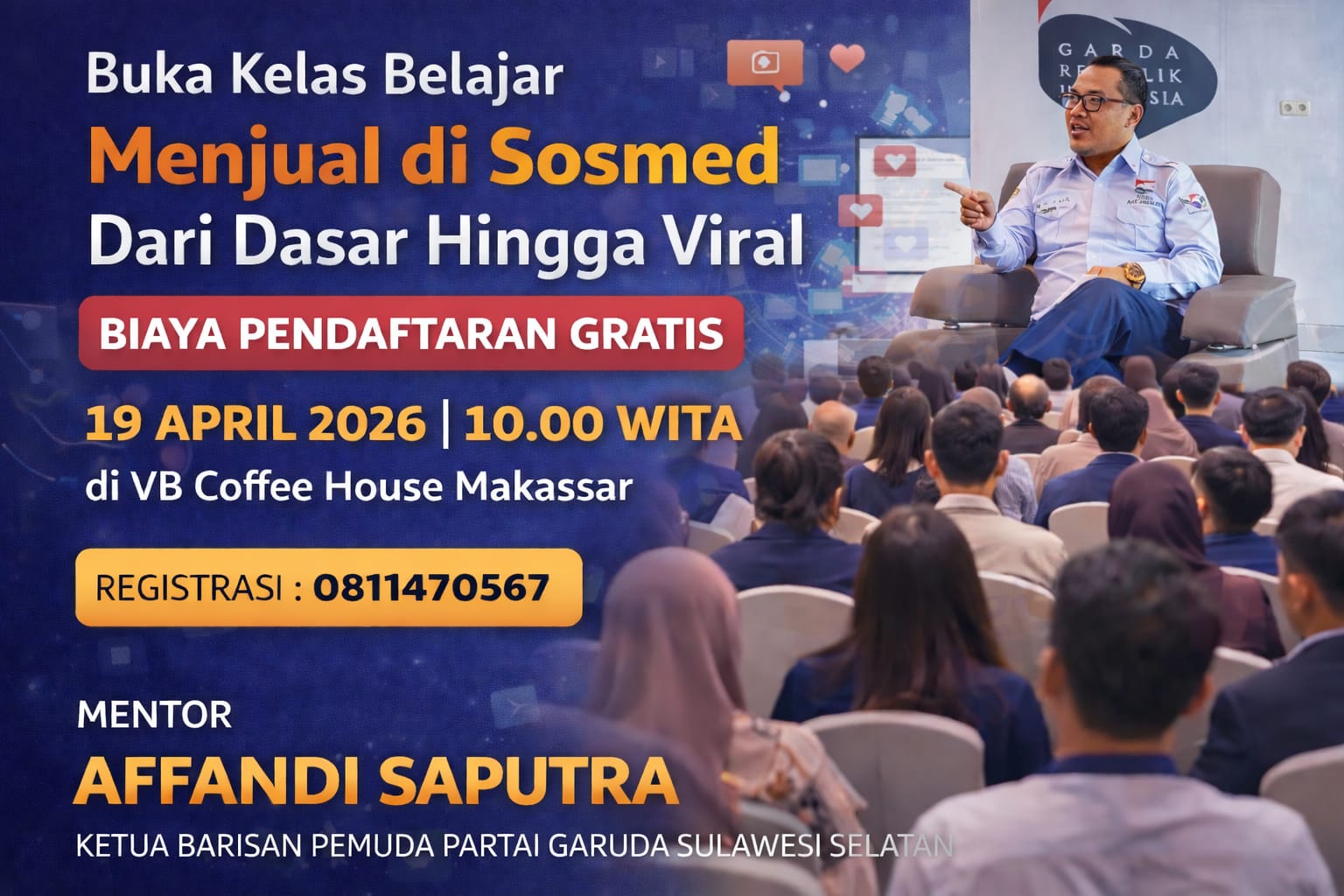 MAKASSAR – Upaya mendorong kemandirian ekonomi anak muda terus digalakkan di Sulawesi Selatan. Kali ini, Barisan Pemuda Partai Garuda Sulawesi Selatan mengelar sebuah kelas belajar bertajuk “Menjual di Sosmed: Dari Dasar Hingga Viral” yang akan diselenggarakan di Makassar.